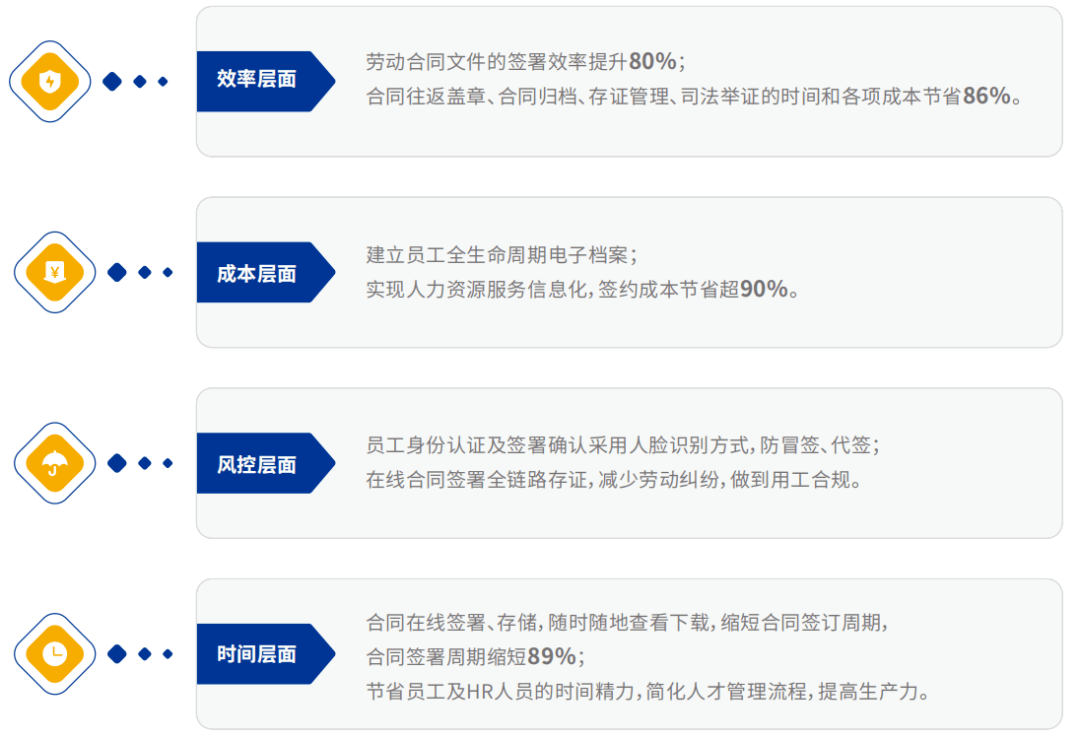 这样一来,借助电子劳动合同,安踏实现了效力、成本、风控、时间四大层面的价值收益: